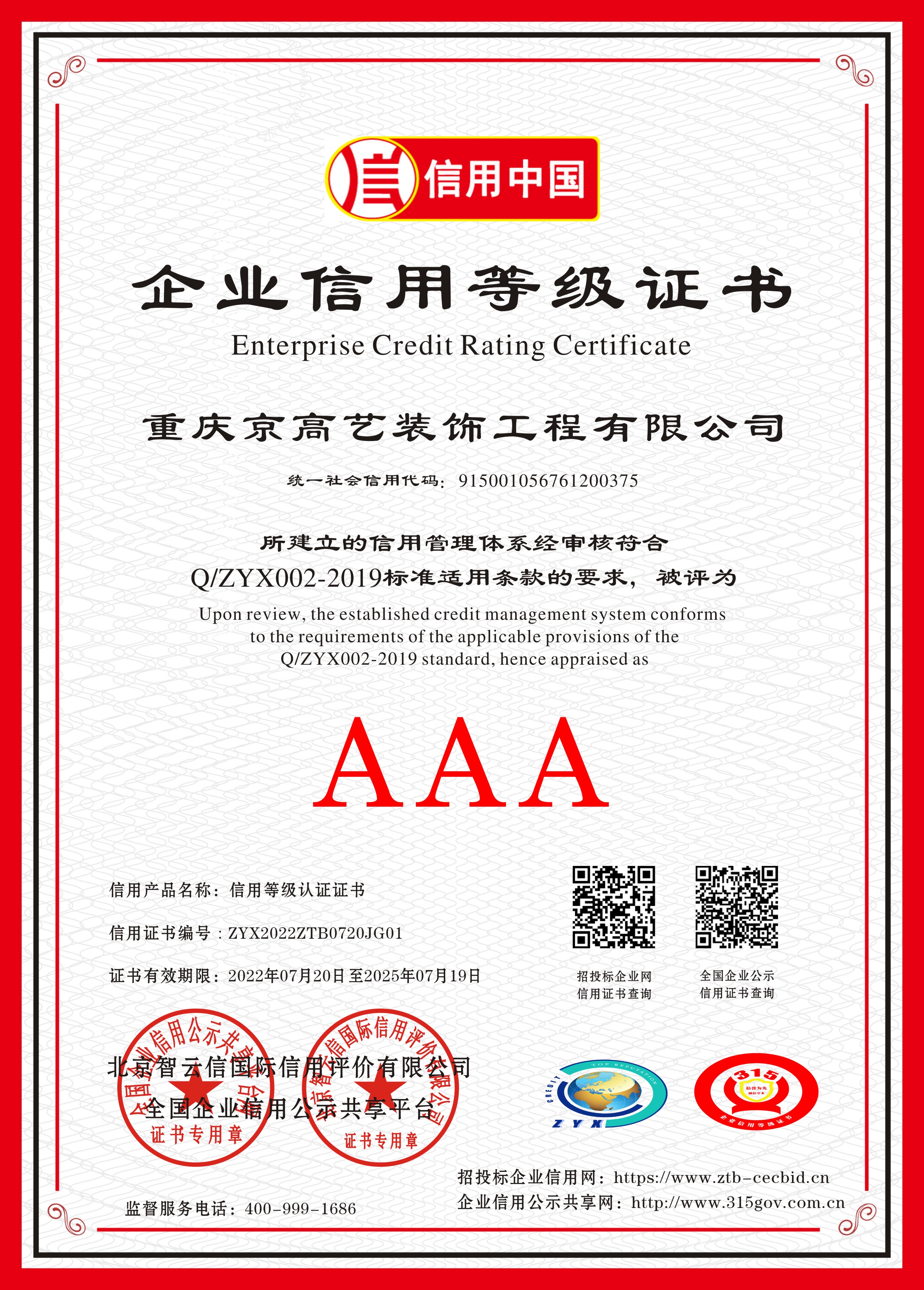 企業(yè)信用等級證書(AAA)